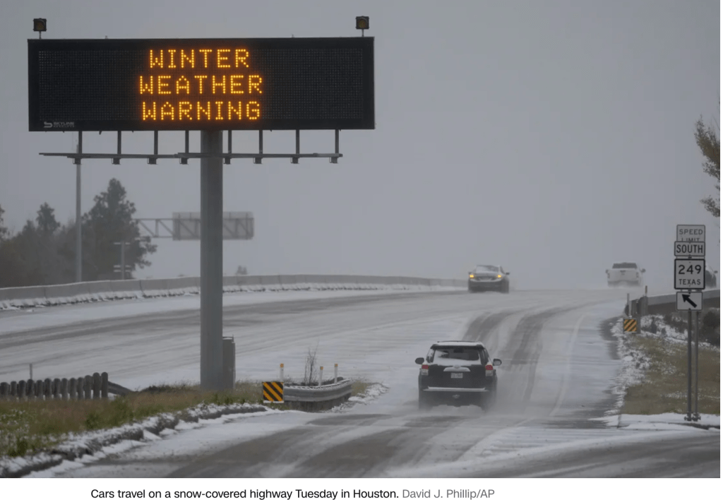 The CNN article also included a screenshot of a post from the University of Houston showing the snow on campus. A different focus of the story could be how this is affecting college students in the south and how they are dealing with this when it comes to going to class and staying warm. Many students in Houston may have never experienced this weather before and are learning how to handle it all at once and some from out of state who have experienced it may be helping those who haven’t.